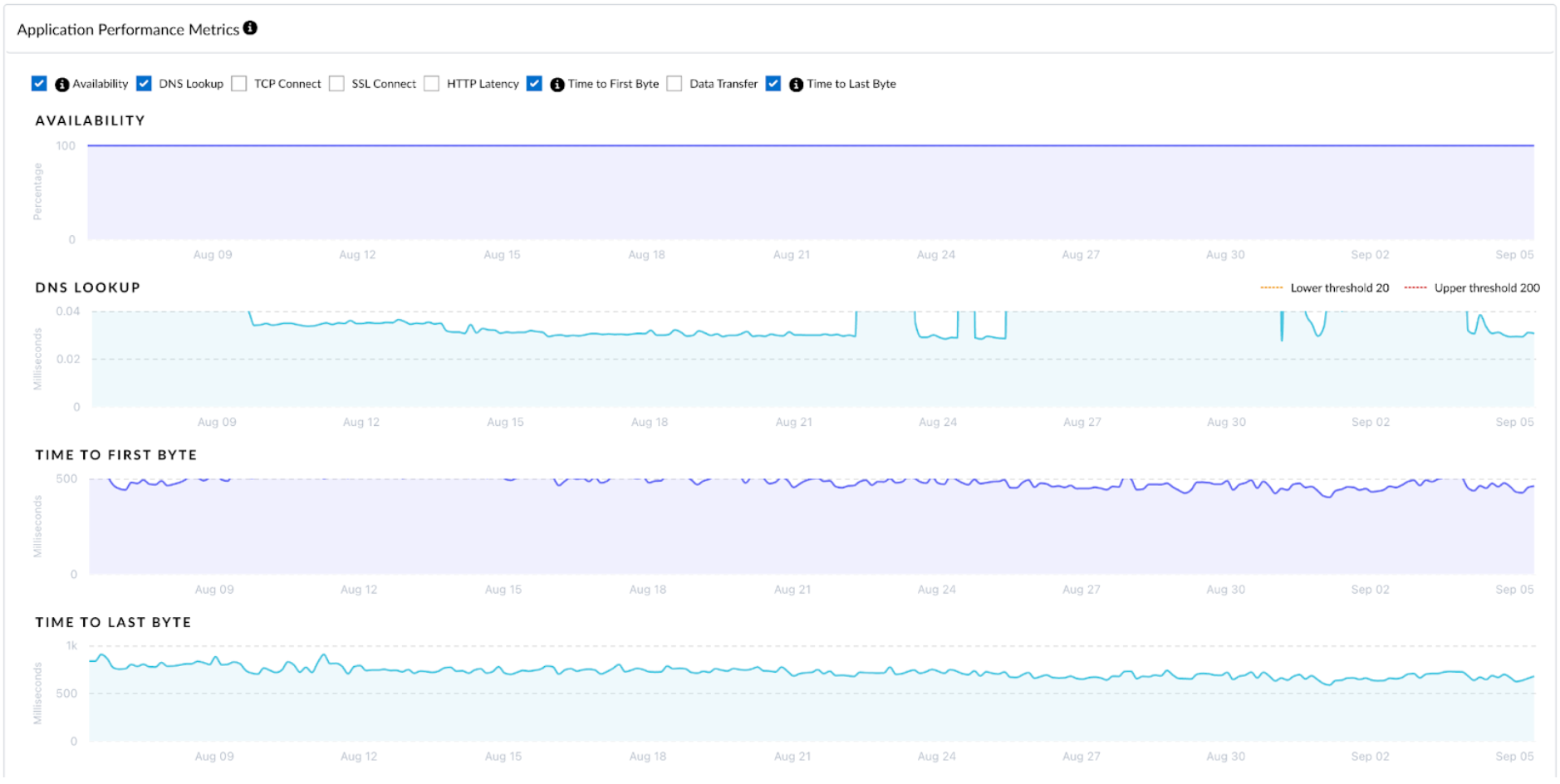 In the Response section, the values shown for each field that is followed by a comment (<<<<<<), for example dnsLookupTime, are the average values for that field in the timeseries. The availability is always 100% which is indicated by 1.